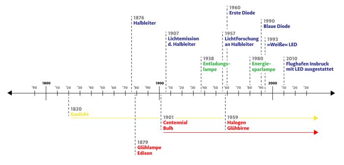 hat sich ab 1993 die LED (Licht emittierende Diode, Leuchtdiode) etabliert. Das Licht entsteht hier nicht durch bewegte Gase, sondern aus Halbleiterkristallen. LEDs geben mit Hilfe einer Optik stark gerichtetes Licht ab, das jeweils eine ganz spezifische Farbe (monochromatisches Licht) hat. Ab den 1970er Jahren waren zunächst rote, gelbe und grüne Dioden herstellbar, die eine sehr geringe Leistung hatten, so dass ihr Einsatz nur in der Signaltechnik (z.B. zur Steuerung von Lichtschranken), für Taschenrechner und Digitaluhren möglich war. Weißes Licht kann mit der LED-Technik grundsätzlich nicht erzeugt werden. Erst die japanische Entwicklung von sehr energieeffizienten blauen Leuchtdioden in den 1990er Jahren machte die LED für die Beleuchtungstechnik interessant. Denn wenn man diese blauen LEDs auf einen Konverterfarbstoff (meist Phosphor) strahlt, kann „weißes“ Licht aller Farbtemperaturen bei geringem Energievebrauch zur Erscheinung gebracht werden. Die Nutzung der LED auf allen Gebieten der Lichttechnik konnte beginnen. Isamu Akasaki, Hiroshi Amano und Shuji Nakamura erhielten 2014 den Nobelpreis für Physik für den Einsatz effektiver Halbleiter in der Lichttechnik der LEDs.
